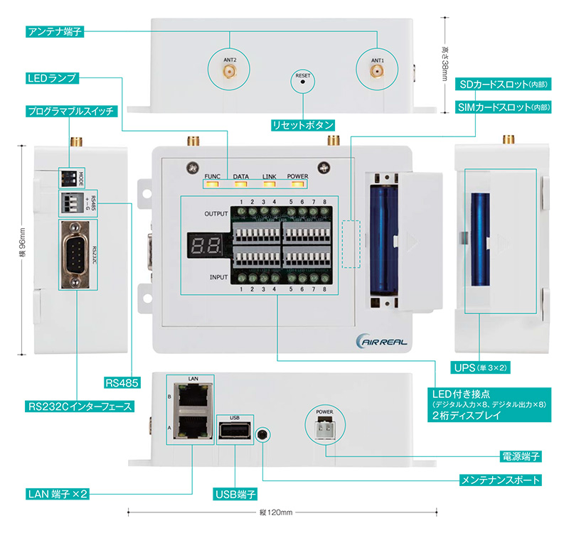 LED 表示 | 単色LED(緑)× 16 3色 LED(緑、赤、黄)×4(Power、LINK、DATA、FUNC) ドット付き7セグメントディスプレイ(2桁) |